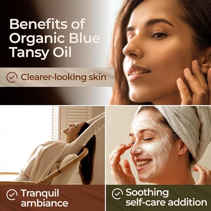 - Moisturizing and soothing on skin. Our organic blue tansy essential oil moisturizes and balances dry-looking skin, and may help with skin protection. Using 1-2 drops of blue tansy face oil day and night may promote a softer-looking complexion.