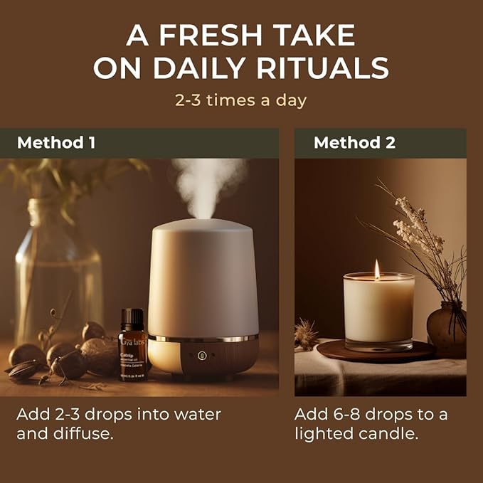 - Catnip essential oil for diffuser & candles. Indulge in our catnip essential oil for an all-natural uplift, especially after those longer days. Add 2-3 drops in a catnip essential oil diffuser or when candle making to refresh your evening routines.