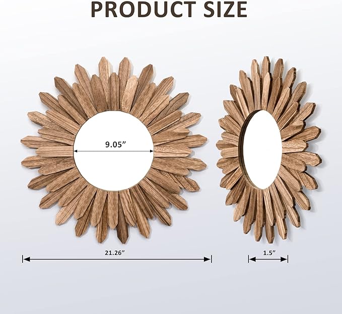 - Easy to Hang: Measure at 21 inch diameter with wood frame and diameter of 9 inch for mirror; Hang this stunning mirror in your bedroom over your bed, in your hallway or entryway, over your living room sofa.No any assembly, quite easy to hang on the wall; Comes with anchor and screw