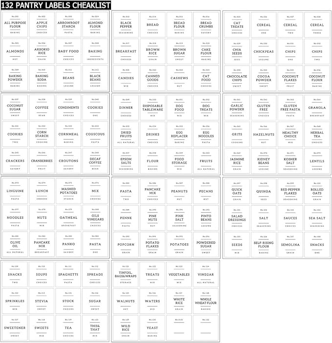 - 【PERFECT FOR PANTRY】132 Kitchen pantry labels for glass jars to keep your food dry and pantry tidy. Minimalist labels are black text on white food labels stickers suitable for all glass food storage jars. Pantry decal organization labels are preprinted on premium waterproof vinyl stickers that won't tear or peel off but can easily be removed.