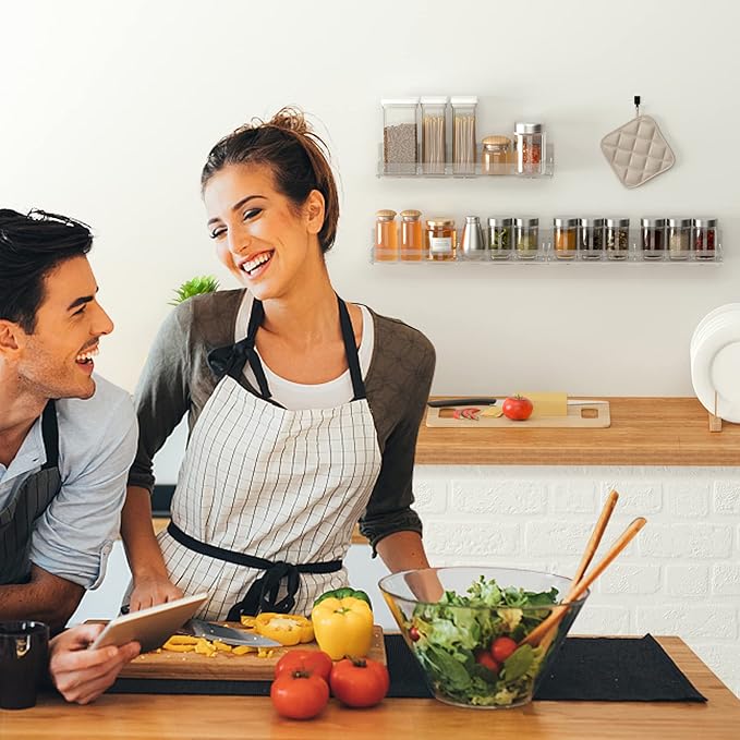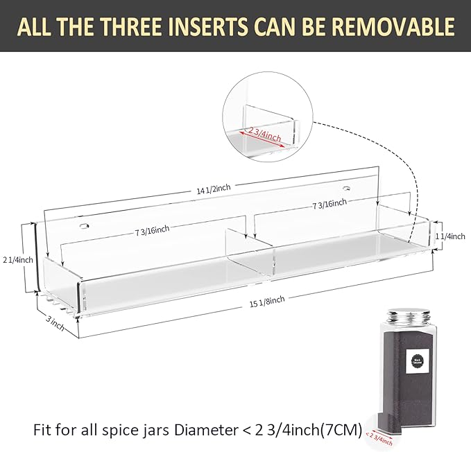 - Unique Design: 4mm super clear acrylic material. The spice racks would be very sturdy and can hold up to 15Lbs. The wall mount spice racks offer clear side inserts to prevent your spice jars from falling off. We also offer an extra insert for each acrylic shelf. You can insert it in the rack middle to be a divider to distinguish different spice jars. Square one or round one. The racks are all seperated that you can adjust the distance according to your jars' height.
