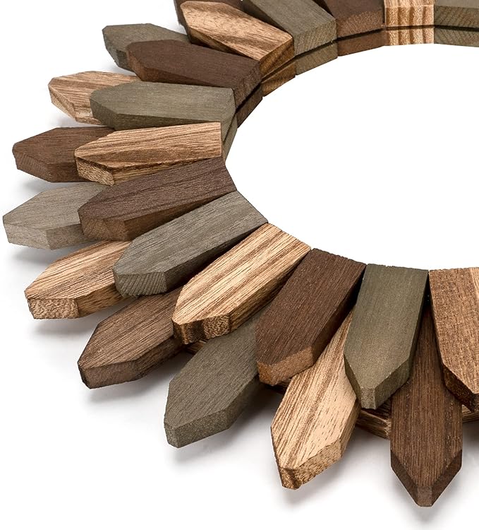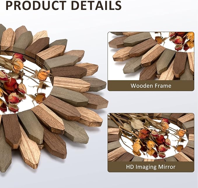 - Boho Wall Decor Mirror: The design of wood sunburst base on the element of boho style, it will be a nice touch and goes well with your others boho decor style; decent decorative piece with perfect size for wall mounted or lean on wall at desk, perfect for your bedroom, living room, bathroom, kitchen and more