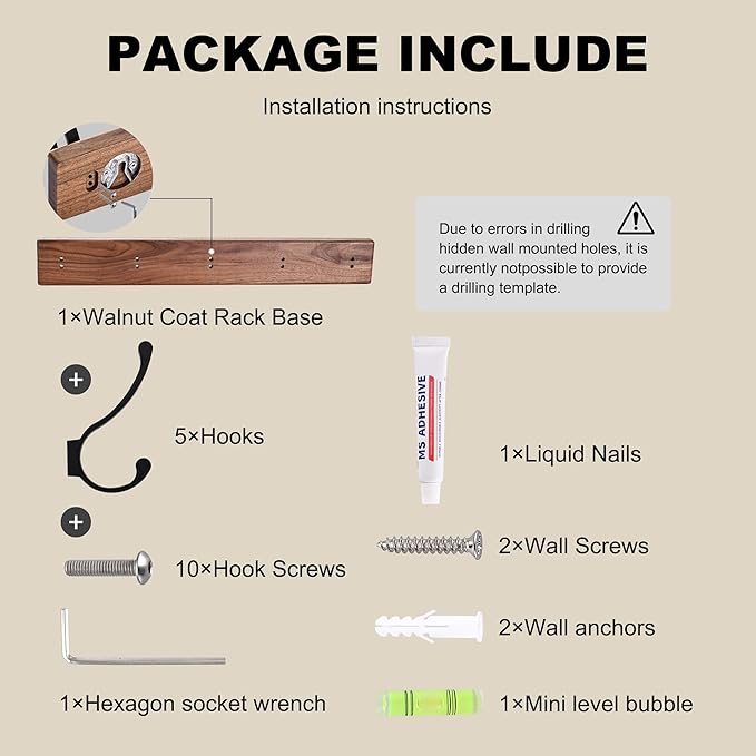 - [Easy to Install]: Due to manual punching, there may be 1-3mm error on the hole spacing. Before installation, please remeasure the hole spacing to ensure the best installation result. To maximize product protection during transportation, our hooks are not installed on a solid wood base and require manual installation. It's not advisable to use nail-free glue on painted surfaces as the adhesion between the coating and the wall isn't strong enough. Using it could cause the paint to peel off.