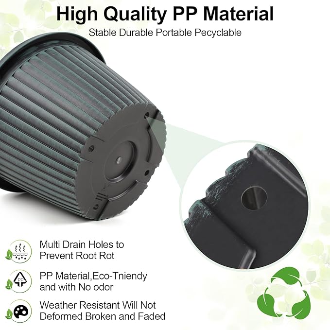 - 【Perfect Size & sturdy Material】Top diameter: 12 inch, bottom diameter: 7.8 inch, height: 8.2 inch, capacity: 2.6 gallon. Large plastic plant pots are made of recyclable polypropylene resin which is lightweight but sturdy, not easy crack. These indoor outdoor planters are UV and weather resistant. 12 inch flower pot is perfect for planting medium to large sized plants.