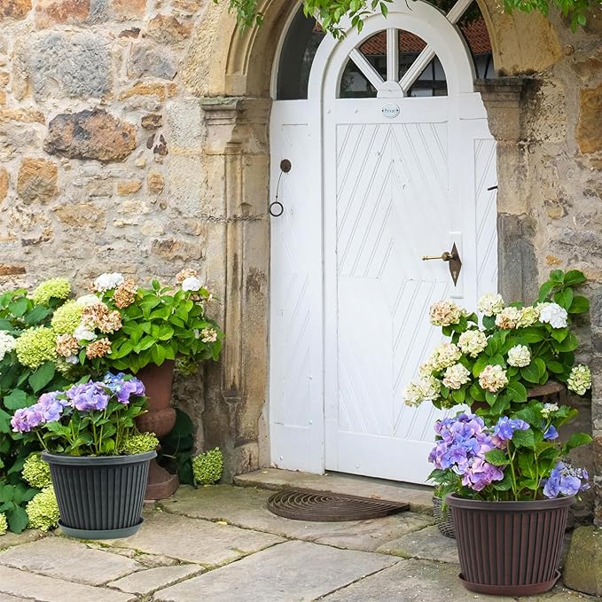 - 【MODERN STYLE PLANTERS】 Indoor planters with saucers provide a unique,nice style in ribbed design which gives an understated elegance that will enhance the beauty of your plant. These 12 inch plant pots are available in red-brown &blue-green & gold finished with a black antique stain. Plastic flower pots would be a beautiful addition to anyone’s deck or sunroom or house!