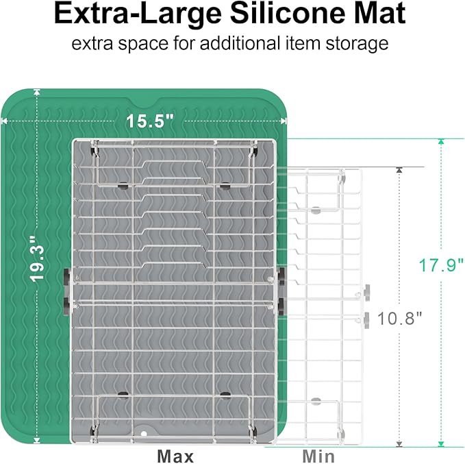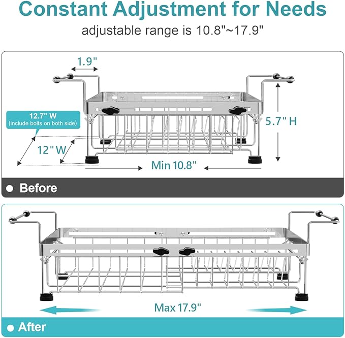 - Capacity Expandable Design: The main body of this dish drying rack is adjustable, making it easy for you to adjust the capacity according to the sink or counter size to maximize the use of space. You can put it in the sink, over the sink or on the countertop. Before purchasing, verify that your sink's size fall within the specified range of 10.8" to 19.4" for a good fit. Size(not include handle length): (10.8~17.9)'' L x 12.7'' W x 5.7'' H