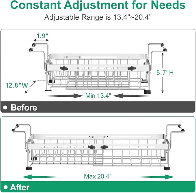 - Space-Saving 3-in-1 Dish Rack: Transform your small kitchen space with the GSlife expandable dish drying rack! Easily adjust the length (13.4" to 20.4" L) to perfectly fit in sink, over sink (up to 22"), or neatly on your countertop. The food-grade silicone mat creates a protective layer between dishes and your sink while being gentle on cookware. This bundle is ideal for apartments, dorms, or compact homes where every inch counts.