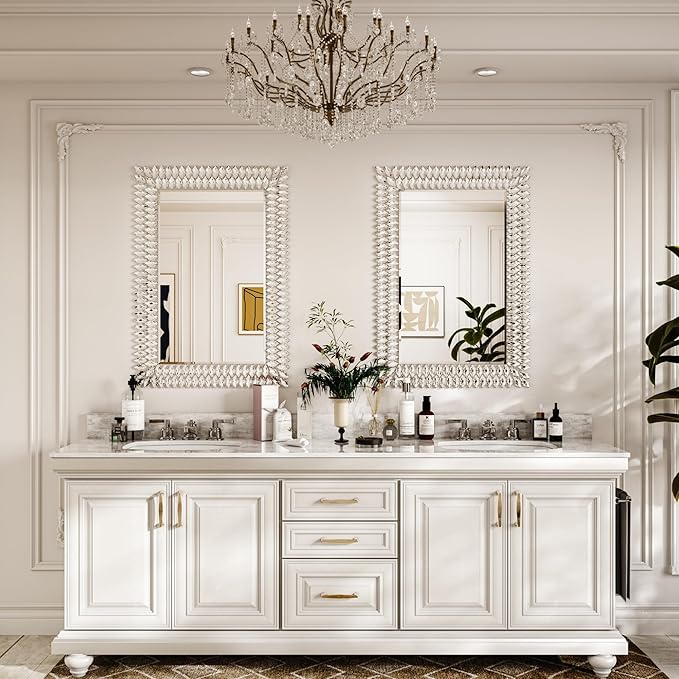 - HIGH QUALITY MIRROR. The product is comprised of a 12mm thick FSC-certified engineered wood and 4mm thick silver coated glass mirror with 1cm bevel. The solid and sturdy MDF back can support and protect the glass mirror, so it is difficult to break. Silver mirrors are characterized with clear, natural images and neutral reflection, which stand out from many other mirror products even from distance. Hang it as a bathroom vanity or above a dresser in a room. It really brings elegance to any wall or space.