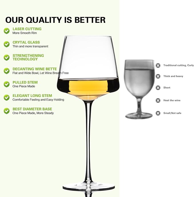 - Handcrafted --- Each wine glass is hand-blown by an experienced master craftsman, by whom the edge is delicately polished and cut for a thin and smooth appearance to provide a better sense of touch for your lips and enhance the quality and flavor of the wine.