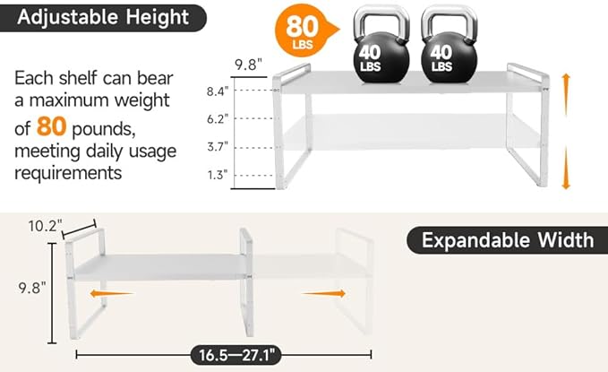 - Easy Installation and Stronger Build: The Cabinet Shelf Organizers are made of sturdy steel and coated with an eco-friendly finish that is rust-resistant, easy to clean, and prevents corrosion. The design includes additional support points on the sides for better stability and a weight capacity of up to 80 pounds.