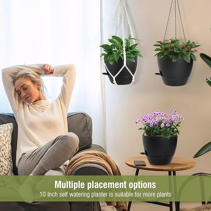 10 inch Self Watering Hanging Planters, 2 Pack Hanging Baskets for Indoor Outdoor Plants, Hanging Flower Pots with Drainage Holes & 2 Kinds of Plant Hangers for Garden Home Decor, Black