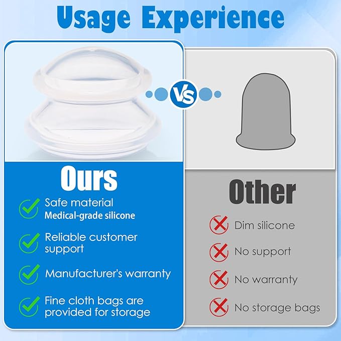 - Include 15pcs Massage Silicone Cups: 2pcs-Extra Large Cups (3.9”x 3”),4pcs-Large Cups (3”x2.2”), 4pcs-Medium Cups (2.4”x1.8”), 5pcs-Small Cups (1.8”x1.4”), A delicate flannel bag, Easy to store those cups.