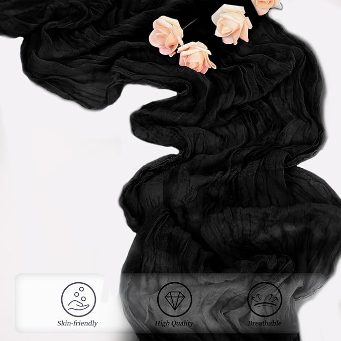 - Cheesecloth Table Runner Size: You will receive 12 black cheesecloth tablerunner, each measuring 20 x 120 inches. The quantity is sufficient for you to decorate various romantic occasions. It can decorate most shaped tables, such as rectangular tables, round tables, and cocktail tables. It is long enough to decorate a large table and be placed perfectly and elegantly on the tabletop, adding a romantic atmosphere to your occasion.