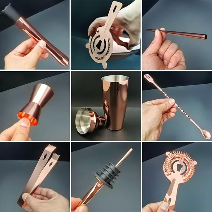 - Bartender Kit included: 1*750ml(25oz) shaker, 1*muddler, 1*15/30ml(0.5/1oz)jigger, 1* ice tongs, 1* ice strainer, 1* fork&spoon, 4 *drinking straw, 4 * Pourer, 1* cocktail Recipes, 1*black stand.