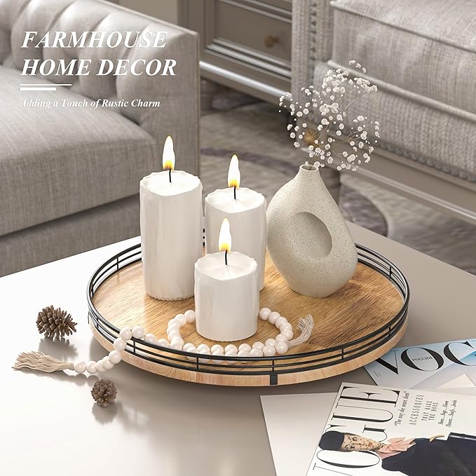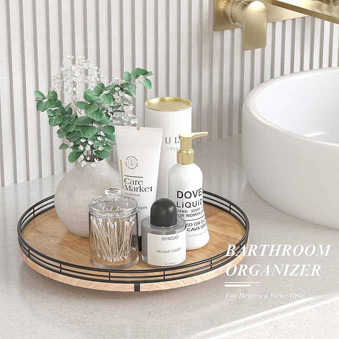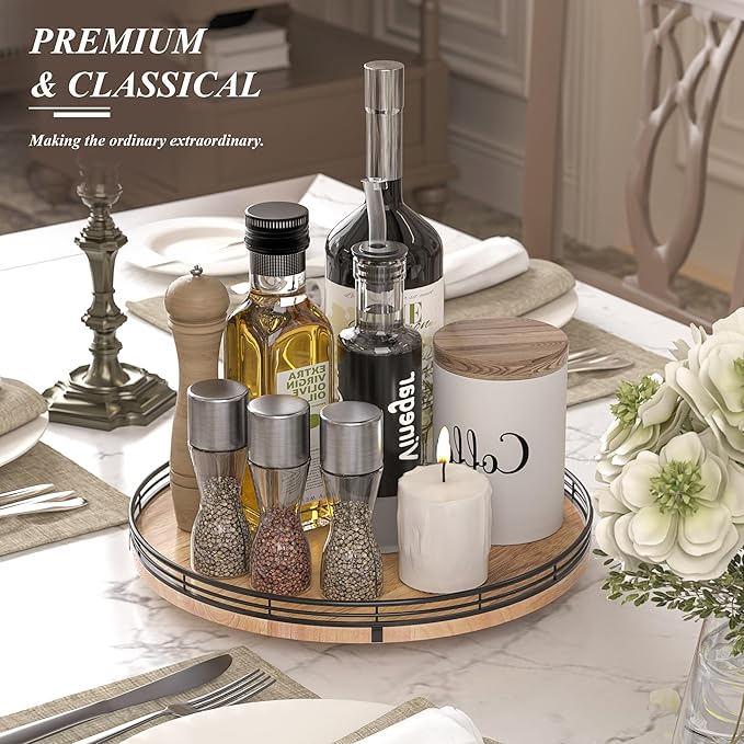 - PREMIUM MATERIAL: Our farmhouse lazy Susan organizer is made of natural solid oak wood and strong metal, sturdy, durable and premium quality. This wooden turntable organizer is a game-changer for keeping your kitchen organized. The farmhouse oak finish gives it a rustic, charming look that will fit perfectly with your kitchen decor.