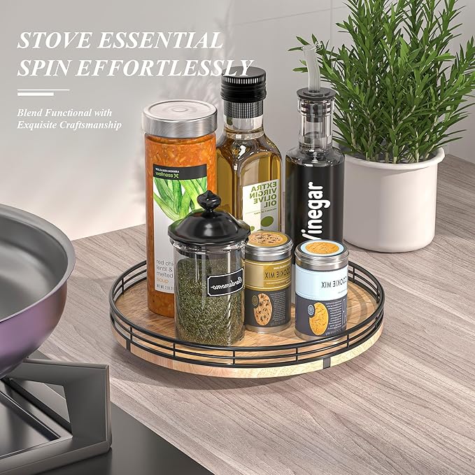 - 360 RATATING & MAXIMIZE SPACE: The base is made of solid wood and the spinning mechanism is made of steel ball bearings, which are well-built and allow for 360° smoothly spin. Making it super easy to access items at the back of your cabinet without having to remove everything in front. You can use it to store spices, condiments, and even small jars, and it keeps everything neatly in place.