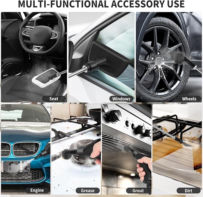- ใ๐๐ฎ๐ฅ๐ญ๐ข-๐ฉ๐ฎ๐ซ๐ฉ๐จ๐ฌ๐ & ๐๐ฎ๐ฅ๐ญ๐ข-๐๐๐๐๐ฌ๐ฌ๐จ๐ซ๐ฒใ: The steam cleaner for home comes with 17 accessories including 2*Small nylon brush, 2*Brass brushes, 2*Big nylon brush, 1*High pressure nozzle, 1*Glass scraper,2*Towel sleeve, 1*Extension pole, 2*rubber rings, 2*Trowels, 1*Gloves, and 1*Towel, the steam cleaner can use different brushes according to cleaning required. Also, the handheld steam cleaner features a steam pipe, power cord and extension tube. Very suitable for cleaning kitchens, cars, tiles, car interiors, and furniture.