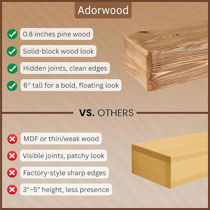 - GENUINE PINE WOOD TEXTURE: Each piece reveals natural knots, small cracks, and unique distressing, ensuring every mantel is one-of-a-kind. Due to the inherent characteristics of real wood, the grain and color may slightly differ from the samples shown.